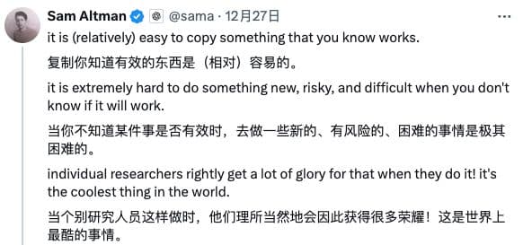 比如奥特曼就搁那说,复制比较简单啦,很难不让人觉得他在内涵 DeepSeek 。