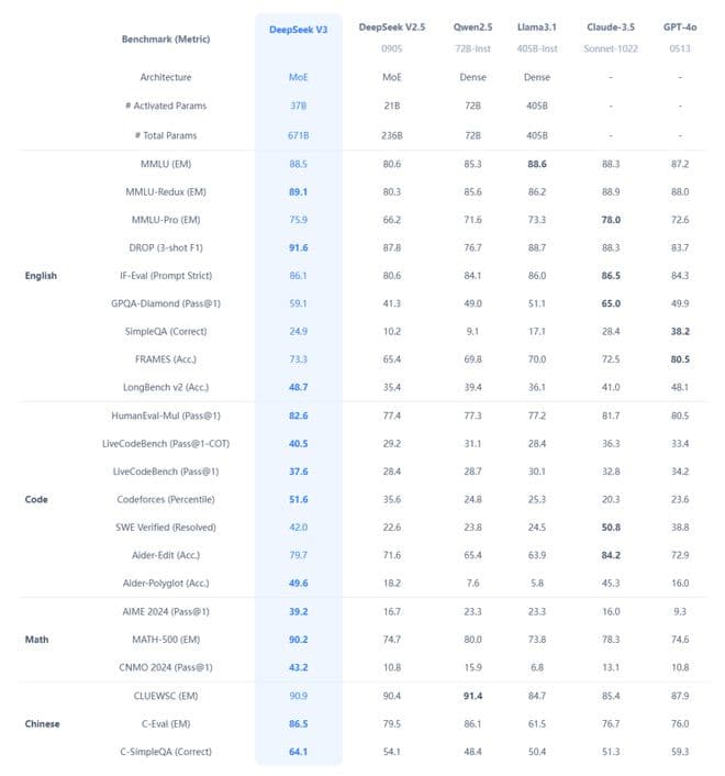 而在各种大厂手里的闭源模型,那些大家耳熟能详的什么 GPT-4o 、 Claude 3.5 Sonnet 啥的, V3 也能打得有来有回。