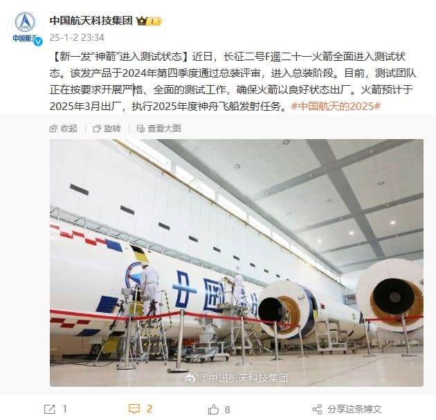 IT之家 1 月 2 日消息,中国航天科技集团刚刚宣布,长征二号 F 遥二十一火箭全面进入测试状态。这枚火箭预计于 2025 年 3 月出厂,执行 2025 年度神舟飞船发射任务。