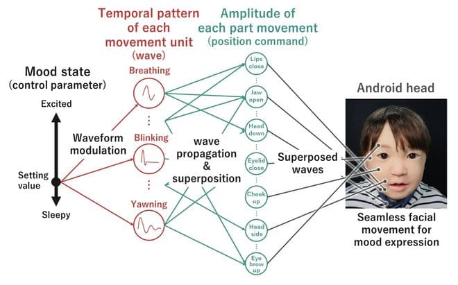 研究人员将打哈欠、眨眼和呼吸等面部动作归类为不同的波形信号,并与嘴唇开合、眉毛移动和头部倾斜等动作幅度挂钩。在实验中,研究人员根据“困倦”到“兴奋”的情绪光谱设置控制参数。这些波形通过传播和叠加动态调整机器人的面部特征表现,从而避免了过去为每种表情手动编排动作的复杂过程。