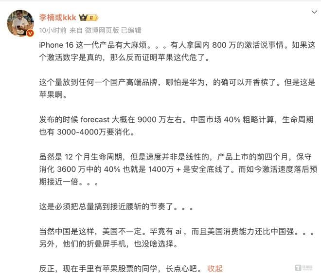 此前,有博主发文称,苹果iPhone 16 Pro系列国内激活销量已经超800万台。从旗舰手机的销量来看,三个月内800万激活量,已经是遥遥领先的存在。但由于是苹果,这个成绩算不上合格。前魅族高管李楠也在社交平台上指出,“这个量放到任何一个国产高端品牌,哪怕是华为,的确可以开香槟了,但是这是苹果啊,如今激活速度落后预期接近一倍。”