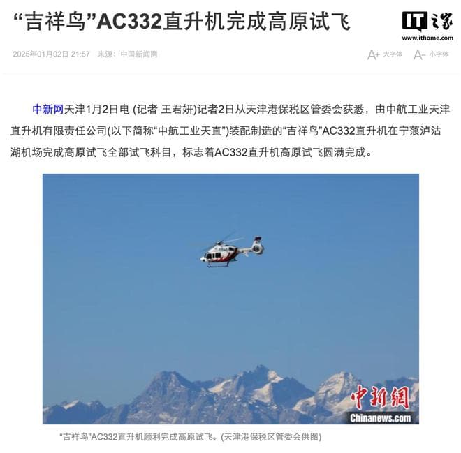 IT之家 1 月 3 日消息,据中新网 2 日报道,由中航工业天津直升机有限责任公司 (以下简称“中航工业天直”) 装配制造的“吉祥鸟”AC332 直升机在宁蒗泸沽湖机场完成高原试飞全部试飞科目,标志着 AC332 直升机高原试飞圆满完成。