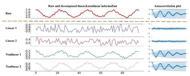 Fig.1 现实世界的时间序列往往是多种线性和非线性的交叠。上图中红色的序列可以被表征为其下方的两种线性和两种非线性模式的加和。