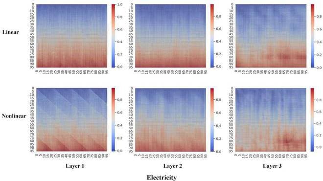 Fig.3 Fig2 中用于预测各个线性和非线性分量的抽象权重的可视化。可以看到每种模式的预测权重是各有差异的。