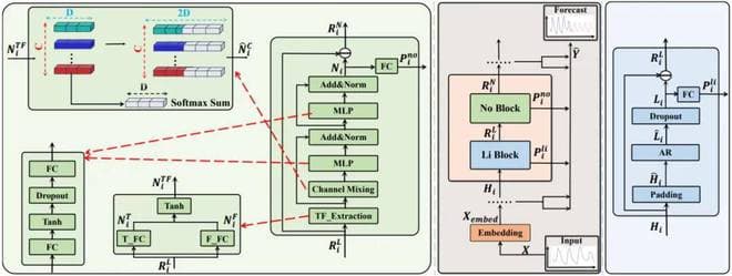LiNo 框架的算法核心在于其递归残差分解(RRD)策略,该策略灵感来源于经验模态分解(Empirical Mode Decomposition, EMD)。LiNo 采用两个主要的模块:Li 块和 No 块,分别负责线性和非线性模式的提取。