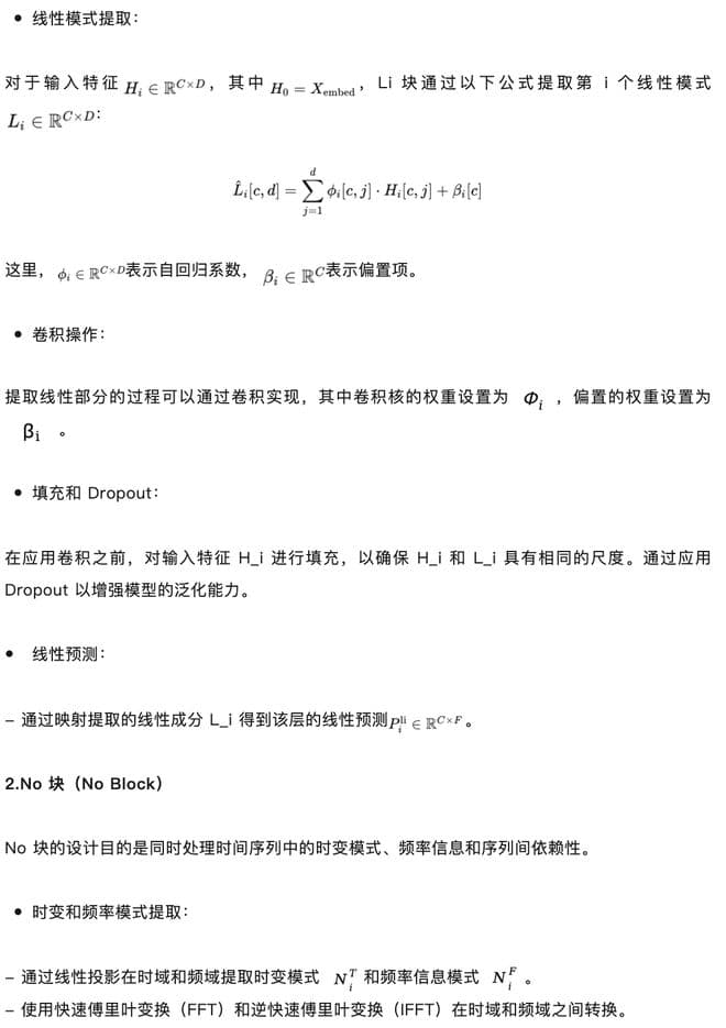 Li 块(Linear block):这一模块负责提取时间序列中的线性模式,如趋势和周期性成分。通过学习时间序列数据的自回归特性,Li 块可以捕捉长期依赖关系。Li 块可以采用移动平均核或其他线性滤波器,以捕捉数据中的线性结构。No 块(Nonlinear block):这一模块负责提取时间序列中的非线性模式,如突变和复杂的季节性变化。No 块可以采用 Transformer 编码器或 TSMixer 等其他非线性模型,以捕捉数据中的非线性动态。通过交替和递归地应用 Li 块和 No 块,LiNo 框架能够逐步剥离并提取时间序列中的复杂模式,直到残差信号中不再包含有用的信息。在经过多个 LiNo 块的处理后,最终的预测结果是通过聚合所有 Li 块和 No 块的输出得到的。