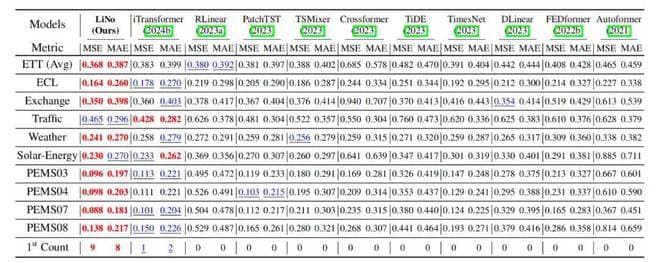 在涵盖电力、金融、交通等 13 个广泛使用的真实世界数据集上,无论是单元时间序列预测还是多元时间序列预测,LiNo 均取得了优于现有最先进方法的性能,而且展现出优异的鲁棒性。