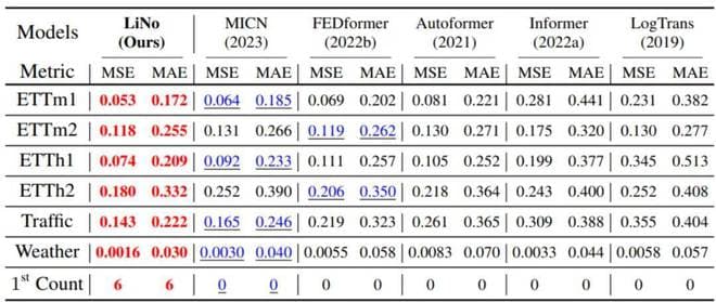 LiNO 框架在单变量时间序列预测任务中展现了顶尖的性能,根据表 2 的分析,它在所有 6 个数据集上都取得了最佳的预测结果。与先前的最先进方法 MICN 相比,LiNO 在六个数据集上将均方误差(MSE)降低了 19.37%,平均绝对误差(MAE)降低了 10.28%。特别是在 Weather、ETTh2 和 Traffic 数据集上,LiNO 分别实现了 47.11%、28.64% 和 12.97% 的 MSE 降低,这标志着预测精度的显著提升。LiNO 在单变量和多变量时间序列预测中的一致优越表现证明了它在不同场景下的广泛适用性。