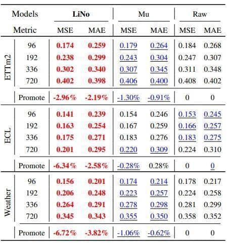 表 3 LiNo 框架对 iTransformer Backbone 的预测精度提升