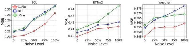 LiNO 框架在单变量时间序列预测领域的表现极为出色,其设计基于 iTransformer 这一领先业界的变换器模型作为基础架构。如表 3 所示,通过与 'Raw'(传统设计)和 'Mu'(N-BEATS 中使用的递归表示分裂预测设计)的比较,LiNO 在 ETTm2、ECL 和 Weather 数据集上实现了 2.96%、6.34% 和 6.72% 的 MSE 降低,这一成就凸显了其在有效分离和处理线性与非线性模式方面的高效率。此外,LiNO 在面临不同噪声水平的挑战时,依然展现出了卓越的鲁棒性和可靠性,如图 5 所示,这不仅验证了其设计的稳健性,也进一步证实了在时间序列预测模型中区分线性与非线性模式对于提升预测鲁棒性的重要性。
