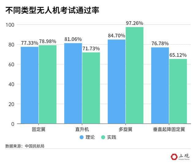 根据民航局公布的不同类型的无人机考试通过数据来看,通过的概率基本上高于60%。而最常见的多旋翼无人机考试通过率在80%以上,实践考试甚至高达97%。