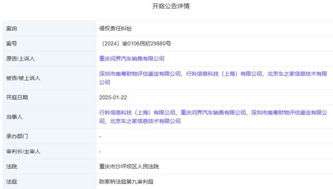 红星资本局1月3日消息,今日,天眼查APP显示,重庆问界汽车销售有限公司新增一条开庭信息。信息显示,问界汽车将深圳市南粤财物评估鉴定有限公司(下称“南粤财物评估鉴定公司”)、行吟信息科技(上海)有限公司(下称“行吟科技”)和北京车之家信息技术有限公司(下称“北京车之家”),以“侵权责任纠纷”案由,起诉至重庆市沙坪坝区人民法院,案件将于1月22日开庭审理。