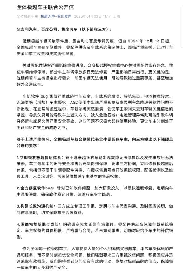 公开信中,车主们明确提到目前他们面对着关键零配件缺货严重影响维修进度以及车机软件 bug 频发严重威胁行车安全的困境。他们向吉利汽车、百度公司、集度汽车三方提出以下要求: