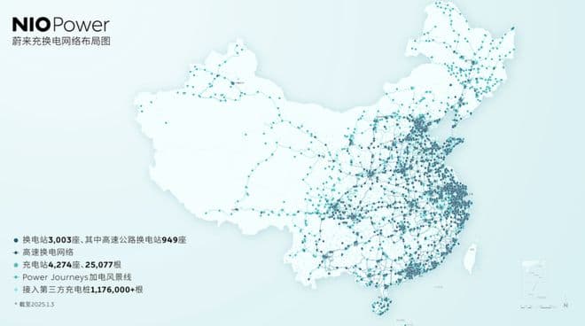 同时,截至 1 月 3 日,蔚来能源已在全国累计建设 3003 座换电站、25077 根充电桩,累计覆盖超 800 个县及县级行政区。