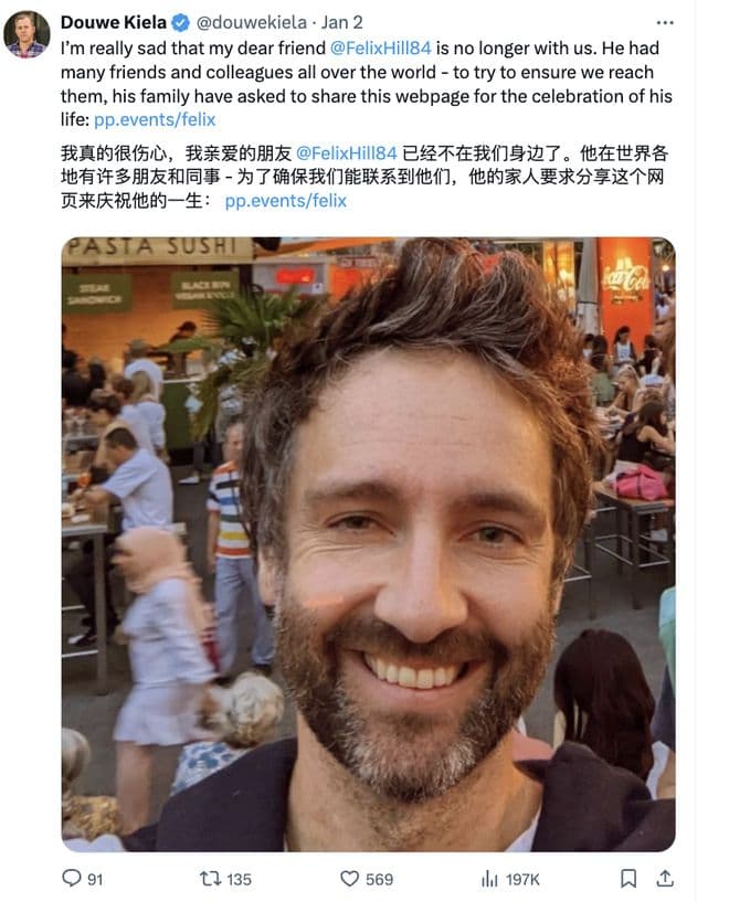 近期,斯坦福大学兼职教授、Contextual AI CEO Douwe Kiela 在 X 平台发文,宣布 Deepmind 研究科学家 Felix Hill ,因长期与严重精神疾病抗争于去年 12 月 5 日遗憾离开人世。