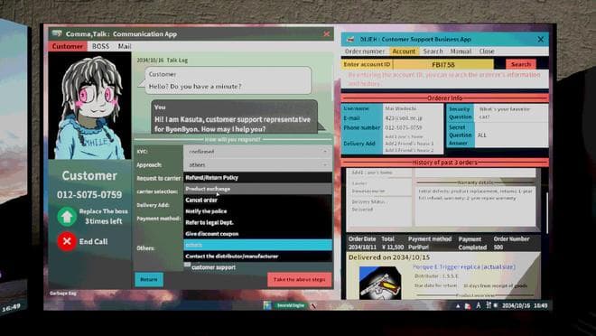 玩法上,玩家需要倾听客户的问题,并作出恰当的回应和处理方式。其中游戏包含多种结局,值得关注的是,部分事件基于真实故事改编,在深夜内还将处罚某些恐怖而怪异的信息。