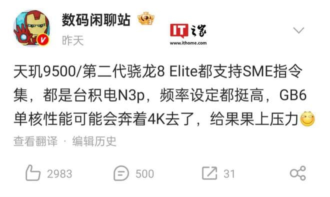 IT之家 1 月 4 日消息,@数码闲聊站 昨日(1 月 3 日)发布微博,表示:“天玑 9500 / 第二代骁龙 8 Elite 都支持 SME 指令集,都是台积电 N3p,频率设定都挺高,GB6 单核性能可能会奔着 4K 去了,给果果上压力”。