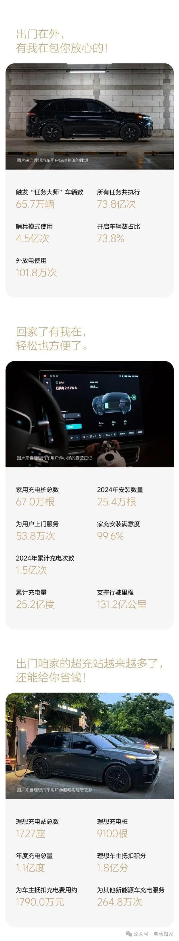 电动知家消息,2025年1月4日,今天理想汽车2024年度用车报告出炉。2024年理想汽车交付了超过50万辆新车,平均每分钟交付一辆,全国已有502家零售中心,覆盖150城。过去一年,所有理想汽车累计行驶里程174.1亿公里,相当于绕地球43.4万圈。其中纯电驱动里程112.7亿公里,燃油驱动里程61.4亿公里。