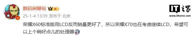 IT之家 1 月 4 日消息,博主@数码闲聊站 今日爆料称,荣耀 X60 标准版用 LCD 反而销量更好了,所以荣耀 X70 也在考虑继续 LCD。