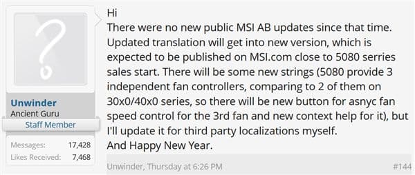 他还透露,新版会针对微星RTX 5080显卡增加一个新功能:支持三个风扇独立控制,可以各自有不同的转速。