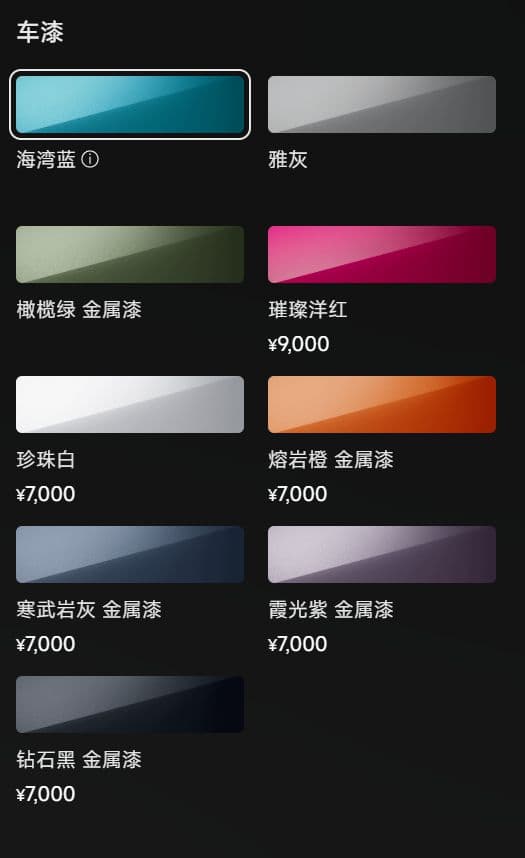 海湾蓝雅灰橄榄绿金属漆璀璨洋红 9000 元珍珠白 7000 元熔岩橙金属漆 7000 元寒武岩灰金属漆 7000 元霞光紫金属漆 7000 元钻石黑金属漆 7000 元