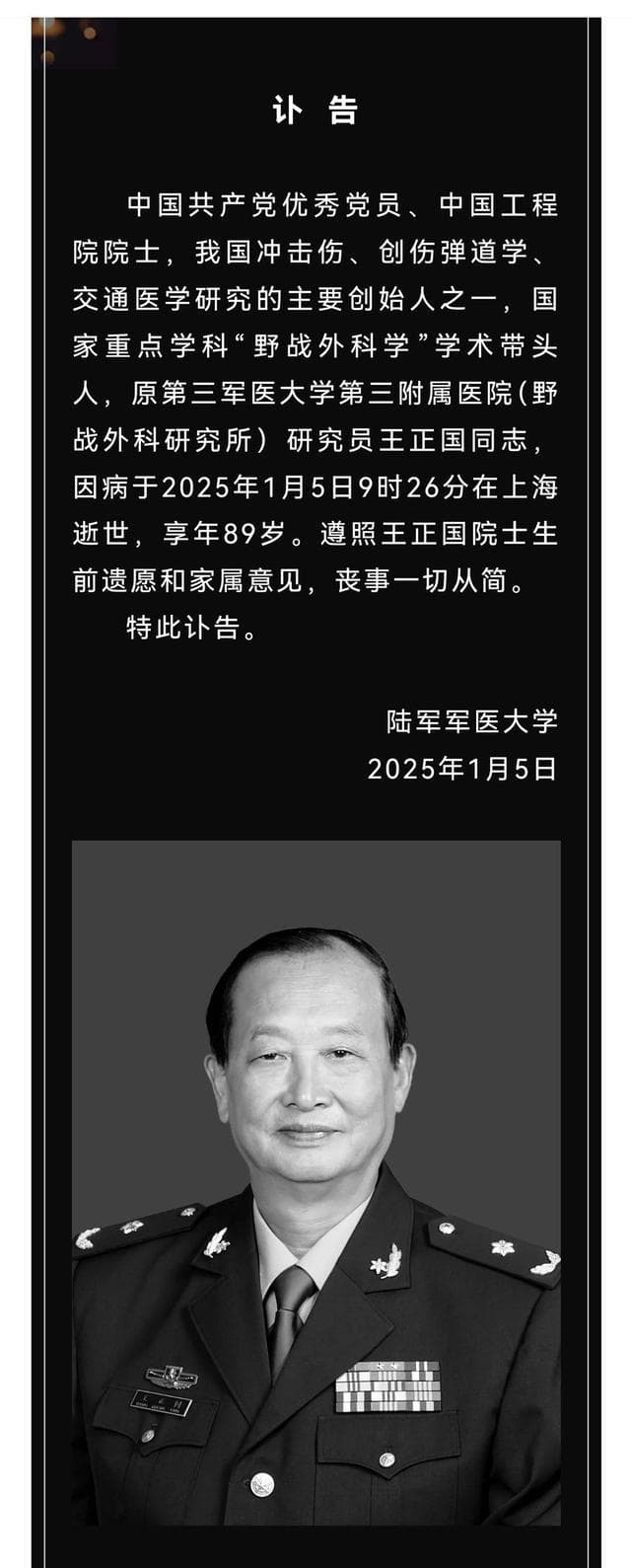 1月5日下午,陆军军医大学发布讣告,中国共产党优秀党员、中国工程院院士,我国冲击伤、创伤弹道学、交通医学研究的主要创始人之一,国家重点学科“野战外科学”学术带头人,原第三军医大学第三附属医院(野战外科研究所)研究员王正国同志,因病医治无效,于2025年1月5日9时26分在上海逝世,享年90岁。