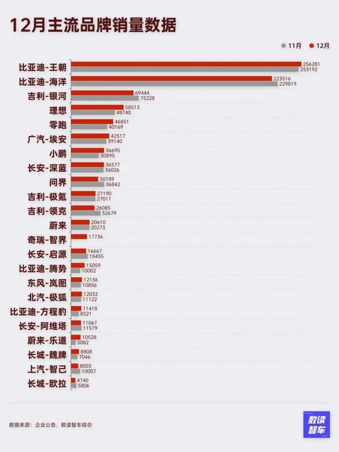 12月,23家品牌中,平均销量达到43594台,突破4万。销量中位数也已达到20610台。只有智己、欧拉等4家品牌月销不过万。