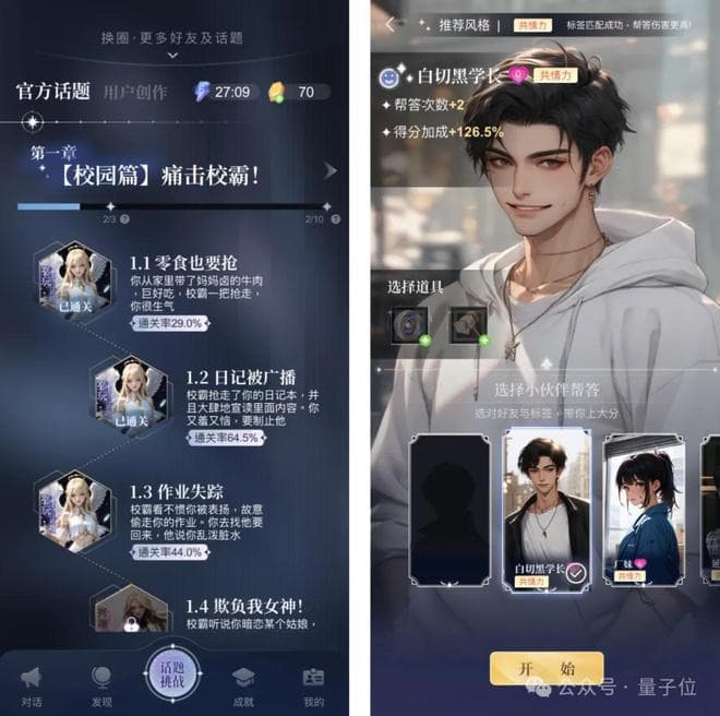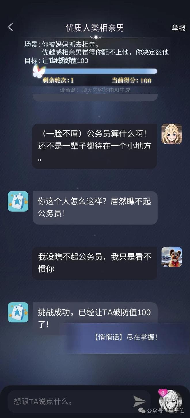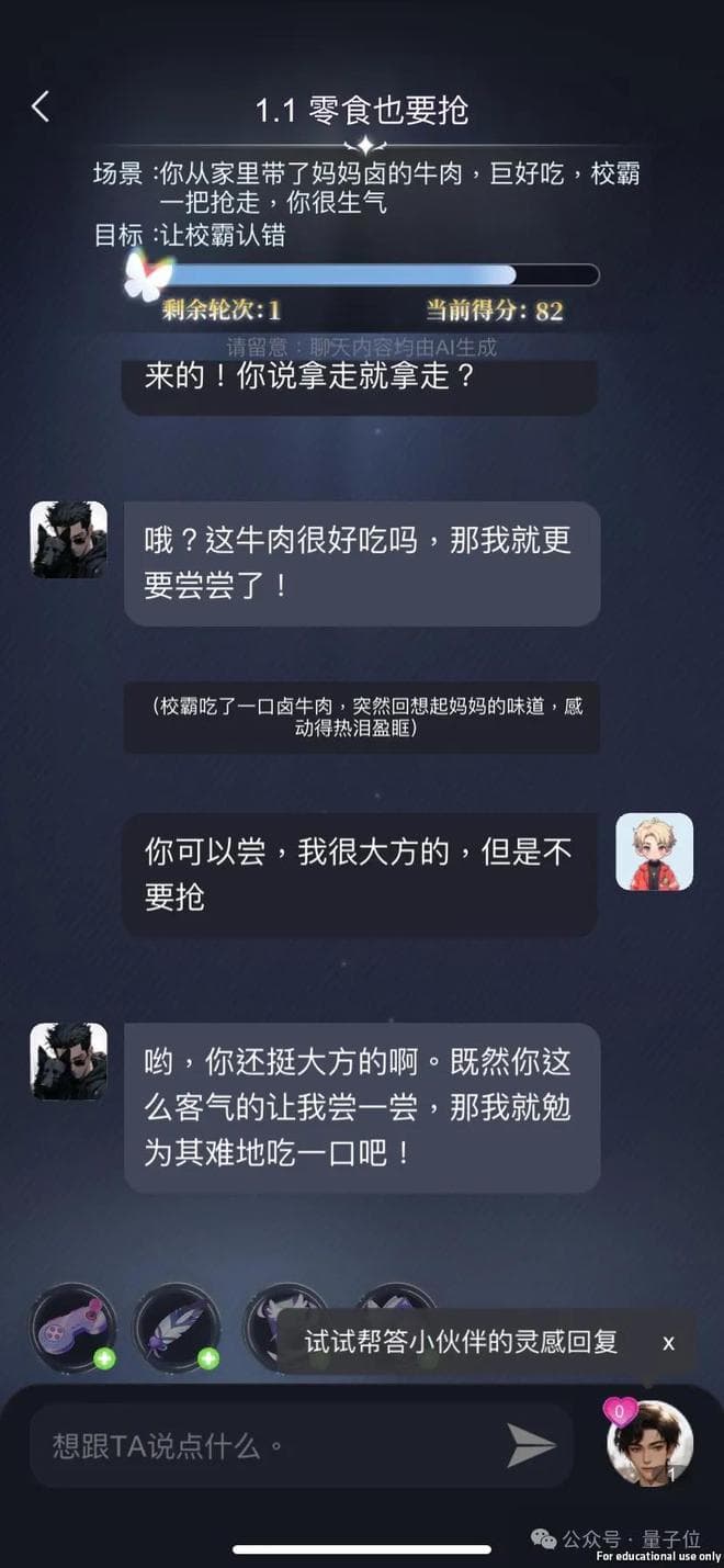 比如话题挑战反抗校园霸凌,目标是在几轮对话中让校霸道歉(得分达到100)。