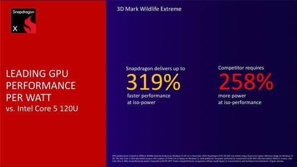 高通声称,在相同功率水平下,骁龙X在3DMark Wildlife Extreme GPU基准测试中比英特尔10核酷睿5 120U性能高出319%,而英特尔芯片需要多258%的功率才能提供相同水平的性能。