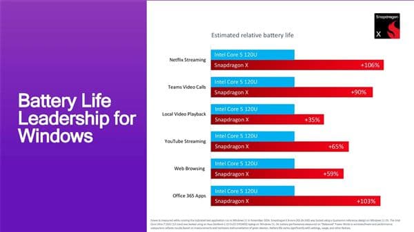 续航方面,高通表示在各种基准测试中,包括流媒体、网页浏览、办公应用和Teams视频通话,其续航比配备酷睿5 120U的笔记本电脑高出35%至106%。