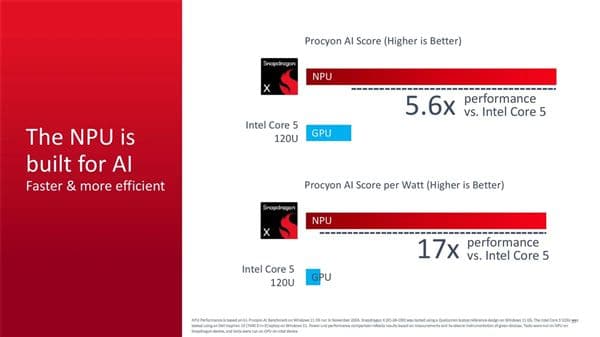 AI也是骁龙X的核心特点,高通声称在Procyon AI评分中具有5.6倍的优势,在测试中的性能功耗比高达17倍。