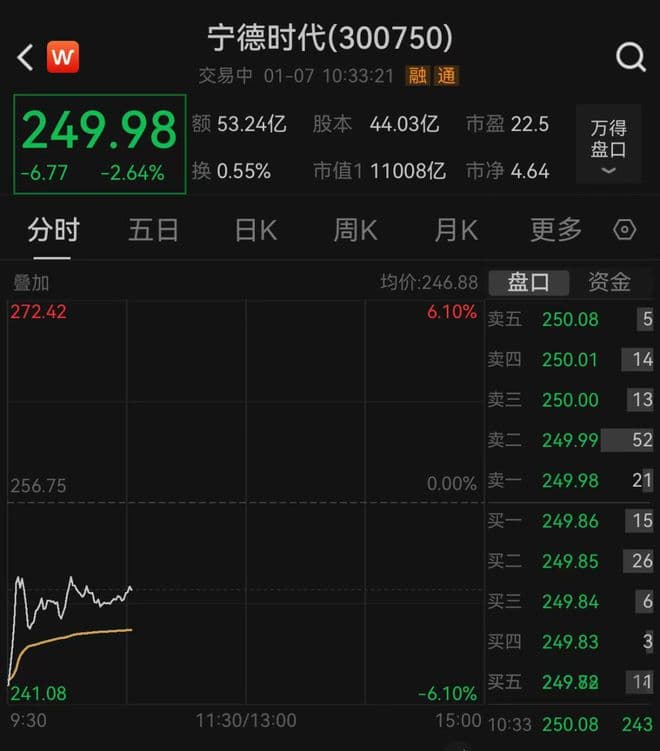 受该消息影响,1月7日,宁德时代低开5.36%,截至10:33,跌幅收窄至2.64%。