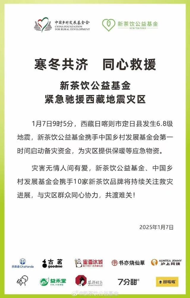 新茶饮公益基金方面透露,该基金将与中国乡村发展基金会一起,携手喜茶、蜜雪冰城、茶百道、古茗等10家新茶饮品牌将持续关注救灾进展,与灾区群众同心协力,共渡难关。