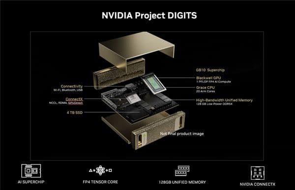 这台AI超算还集成了128GB LPDDR5X内存、4TB SSD,连接方面提供USB、Wi-Fi、蓝牙,操作系统为NVIDIA DGX OS,基于Linux。