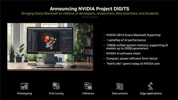 快科技1月7日消息,除了万众焦点的RTX 50系列桌面和笔记本显卡,NVIDIA还带来了一款特殊的整机产品,代号"Project DIGITS"的新一代个人AI超级计算机,身材只有迷你机大小,但可提供千万亿次级的性能,可用于AI大模型的原型设计、微调、运行。