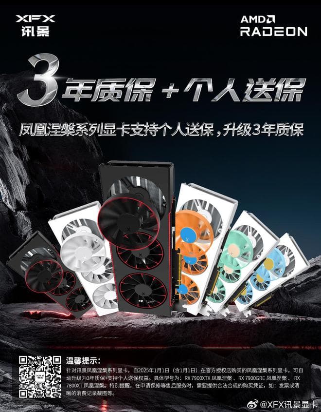根据官方介绍,此次更新涵盖凤凰涅槃系列,自 2025 年 1 月 1 日起在官方授权店购买任意一款凤凰涅槃系列显卡即可自动升级为 3 年质保,包括 RX 7900XTX、RX7900GRE、RX 7800XT 等。