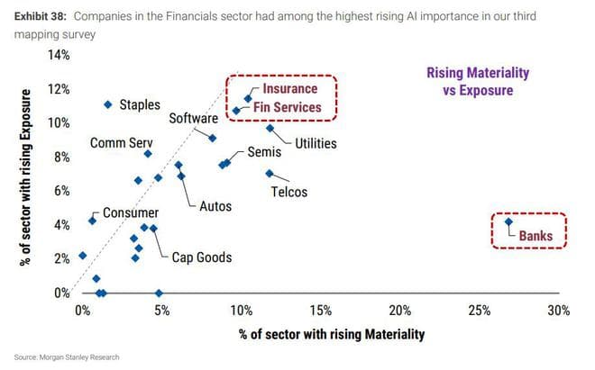 大摩认为,金融业是目前AI发展势头最为迅猛的行业。如果说在过去6个月里,AI电力交易中的公用事业股是选股者的关注焦点,那么2025年金融股也有可能出现类似的变化。