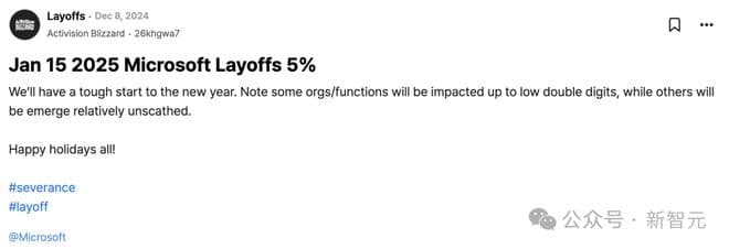 有网友表示,微软即将于2025年1月15日进行大规模裁员,这个比例或高达5%。