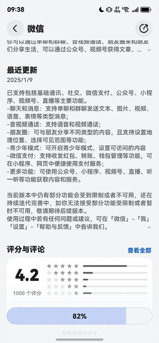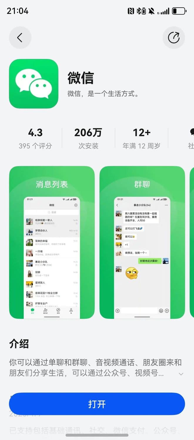 1月9日,原生鸿蒙版微信正式上架鸿蒙应用市场。据了解,经过网友下载体验,原生鸿蒙版微信已支持视频号、折叠消息转发、群红包、转账、小程序等功能,与普通版微信功能基本相同。