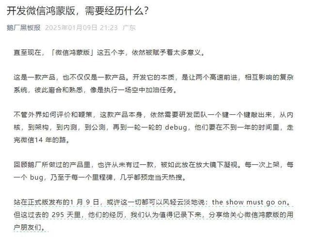 该文表示:“站在正式版发布的1月9日,或许这一切都可以风轻云淡地说:the show must go on。但这过去的295天里,他们的经历,我们认为值得记录下来,分享给关心微信鸿蒙版的用户朋友们。”