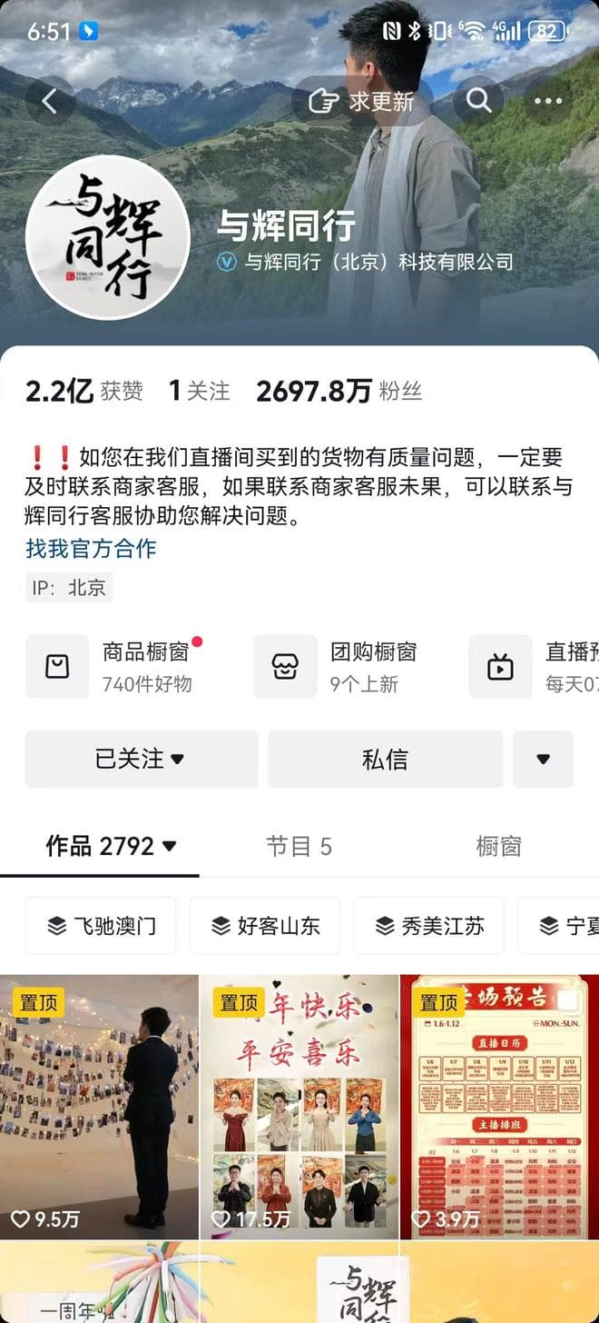 1月9日,与辉同行迎来开播一周年。截至1月10日发稿,与辉同行粉丝量达到2697.8万,董宇辉个人账号粉丝量也达到2684.7万。
