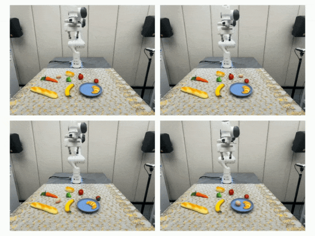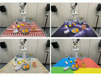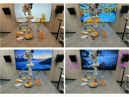 背景泛化。实际环境中,机器人工作场景不尽相同,模型需要面对不同材质、不同纹理的桌面和操作台,甚至动态变化的背景画面。