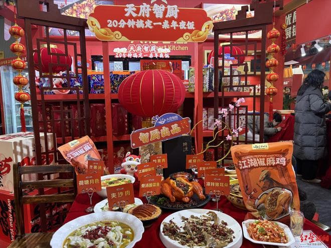 年轻化,也是本次年货节的变化。在天府智厨展区,“20分钟搞定一桌年夜饭”的标语吸引了大家的注意。工作人员杨园园介绍,公司推出399元的年货礼包,包含卤品、碗菜、腊味等8个菜品。“很多年轻人逐渐挑起了‘年夜饭’的大梁,他们更倾向于便捷快速的选择。基于这一趋势,公司希望这些产品不仅能帮助大家节省烹饪时间,还能让大家享受到美味的年夜饭,从而有更多时间与家人共度美好时光。”