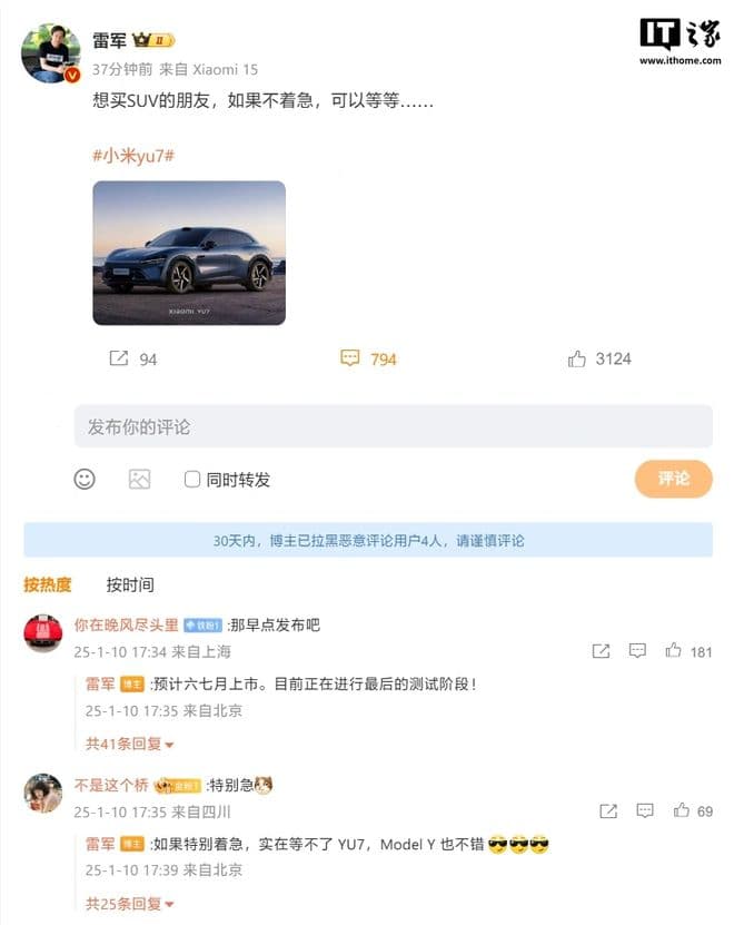 1 月 10 日傍晚,小米创办人、董事长兼 CEO 雷军在微博发文:「想买 SUV 的朋友,如果不着急,可以等等(小米 YU7)……」雷军随后在评论区重申小米 YU7 预计 6-7 月上市,并透露新车正在进行最后的测试。而有网友表示「特别急」,雷军回复:「如果特别着急,实在等不了 YU7,Model Y 也不错。」