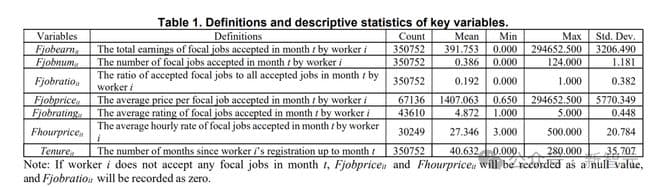 为了确保被处理组和控制组的工人可比,作者还使用了倾向得分匹配(PSM)方法,通过考虑工作者的经验、接受的核心工作总数、工资(即核心工作的平均价格和小时费率)以及工作质量(即核心工作的平均评分)来改善样本平衡。