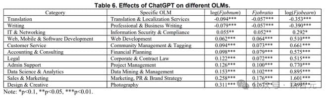 总体而言,论文发现,与建筑设计OLM相比,ChatGPT对翻译与本地化OLM产生了显著的替代效应。