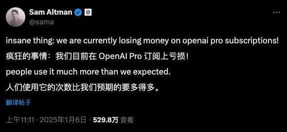 前几天奥特曼自己也发了个推吐槽,就算现在会员费每月 200 美元,可他也没想到用 gpt 的人实在太多了,这些会员费收上去还是亏。。。