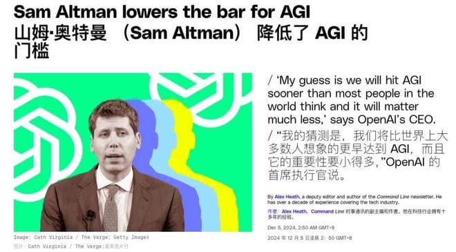 但在 12 月的 DealBook 峰会上,奥特曼又表示 OpenAI 对 AGI 的定义现在没有以前那么宏大了。