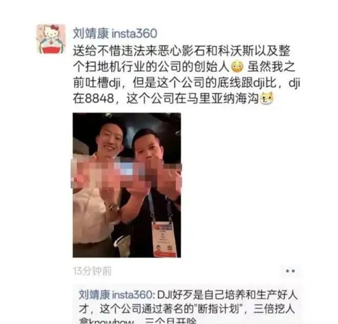 1月10日,一级市场再出大瓜,运动相机品牌影石360创始人刘靖康在朋友圈怒怼某知名科技公司以“断指计划”恶意挖人,且用三个月即废。在朋友圈,刘靖康更是直接竖起中指。刘靖康表示:“送给不惜违法来恶心影石和科沃斯,以及整个扫地机行业的公司的创始人。虽然我之前吐槽DJI,但是这个公司的底线跟DJI比,DJI在8848,这个公司在马里亚纳海沟。”刘靖康还补充道,大疆是自己培养和生产好人才,这个公司通过著名的“断指计划”,三倍挖人拿专有技术,三个月开除。