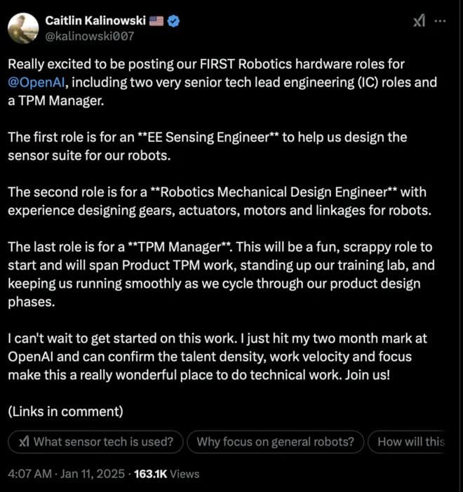 1 月 11 日,OpenAI 硬件主管发了一条招聘信息,显示 OpenAI 正重新组建机器人部门,包括自主研发机器人及定制传感器套件。公开资料显示,Kalinowski 于去年 11 月加入 OpenAI,此前曾在 Meta 的 AR 眼镜部门领导硬件工作。